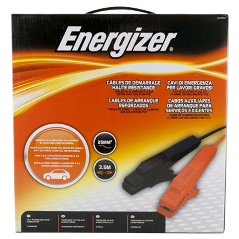 Potentes cables de arranque ENERGIZER de 3.5 metros, 350 Amp. y 25 mm. de diámetro para motores gasolina de hasta 5000cc. y motores diesel de hasta 3500cc. con los que nunca te quedarás tirado. Imprescindible llevarlos siempre en el vehículo.