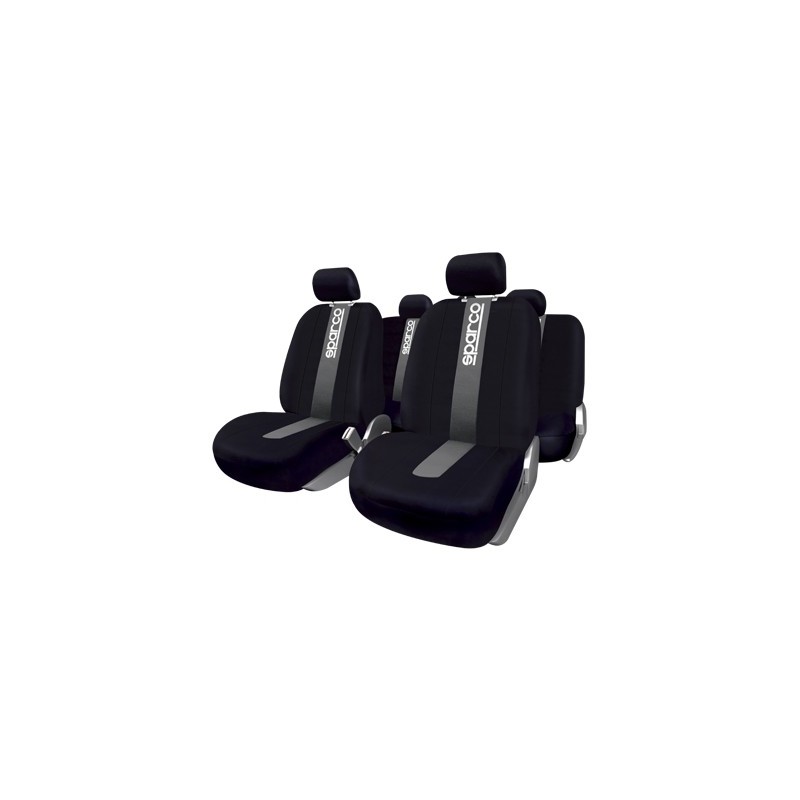 Juego de fundas Sparco de 11 piezas negras con detalle en gris y logo SPARCO en blanco, con trasera partida y compatible con airbag lateral, de textura suave y lavable con un paño húmedo, es la solución para darle a tu coche este toque deportivo de la marca SPARCO.