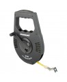 Cinta para agrimensor de fibra resistente con graduaciones métricas e imperiales. Cajetín de plástico resistente con rebobinador plegable. Gancho metálico. Cinta recubierta de PVC resistente al agua y los arañazos. Grado de precisión: Clase III.