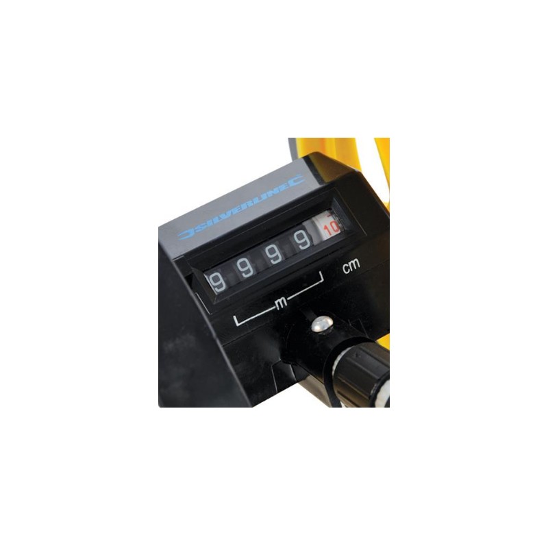 Compacto, capacidad de medición de 0 - 9999,9 m. Cómodo, mango telescópico extensible de 460 - 900 mm. Doble rueda, pantalla analógica con el botón de posición cero. Ruedas plegables para almacenar fácilmente y bolsa de transporte.