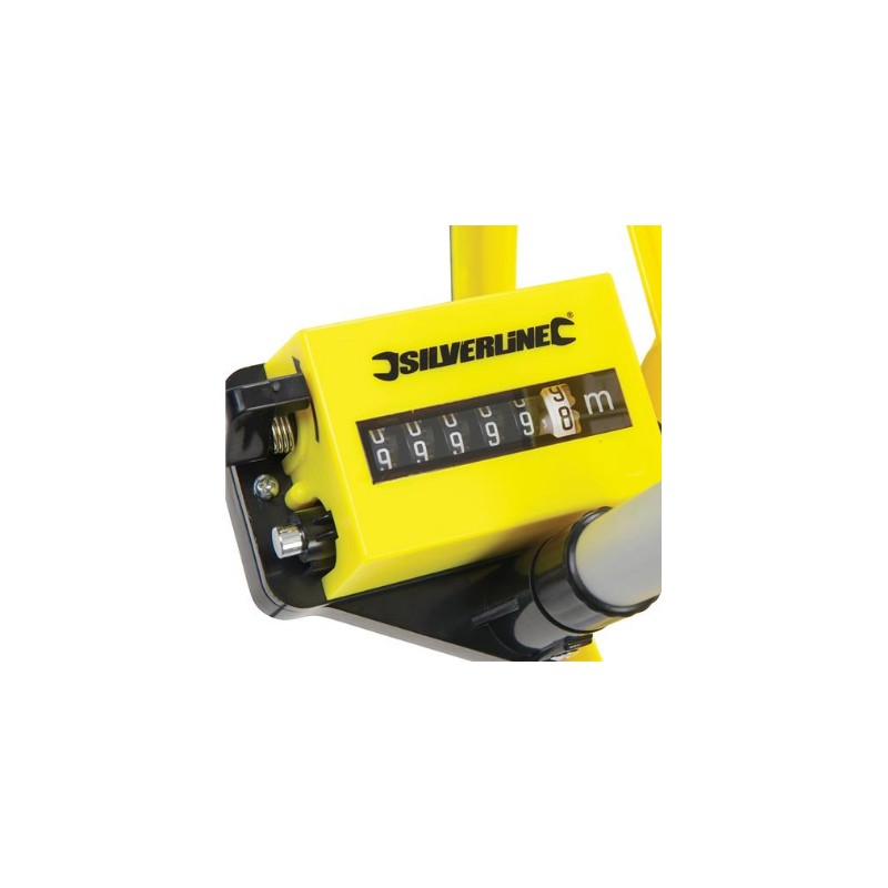 Mango de aluminio con empuñadura engomada. Capacidad de medición de 0 - 99.999,9 m. Rueda de plástico. Ligero y resistente, función instantánea de posición cero. Soporte y bolsa de transporte. Mango ajustable de 475 - 800 mm.