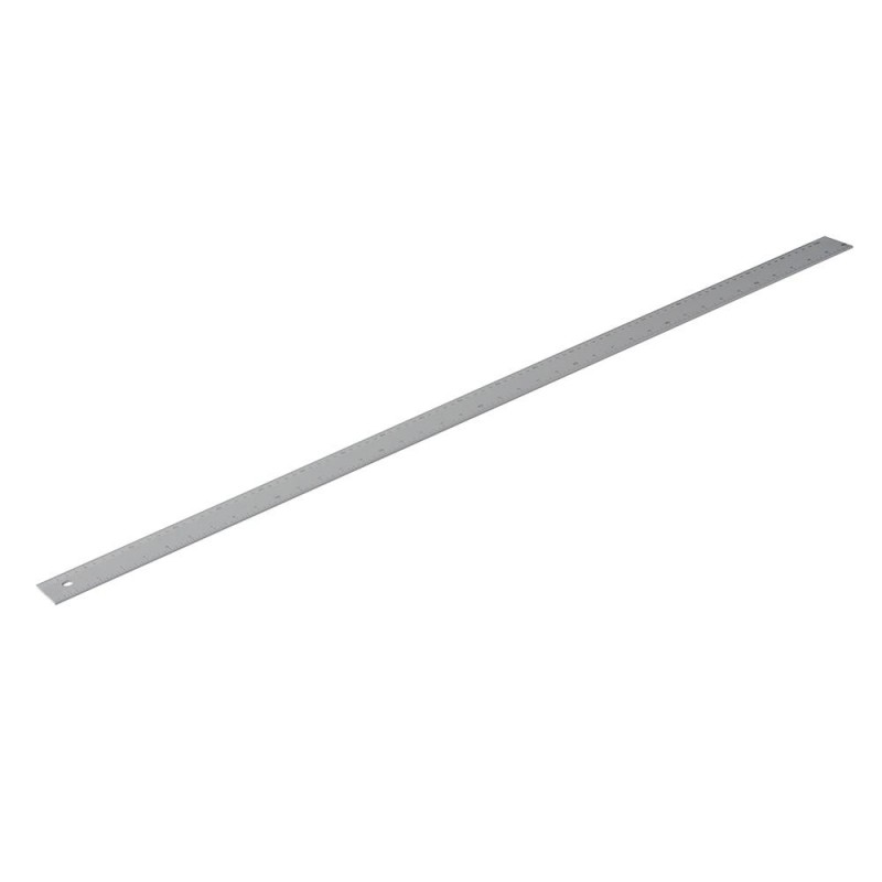 Regla de aluminio con graduaciones métricas e imperiales y agujero para colgar.