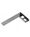 Falsa escuadra ajustable con hoja de acero de graduaciones métricas e imperiales, mango de plástico con nivel de burbuja y tornillo de fijación.