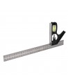 Escuadra de aluminio con acabado mate y nivel de burbuja, hoja de acero inoxidable marcada con graduaciones métricas e imperiales en ambas caras. Incluye ángulo de 45° para ingletes.