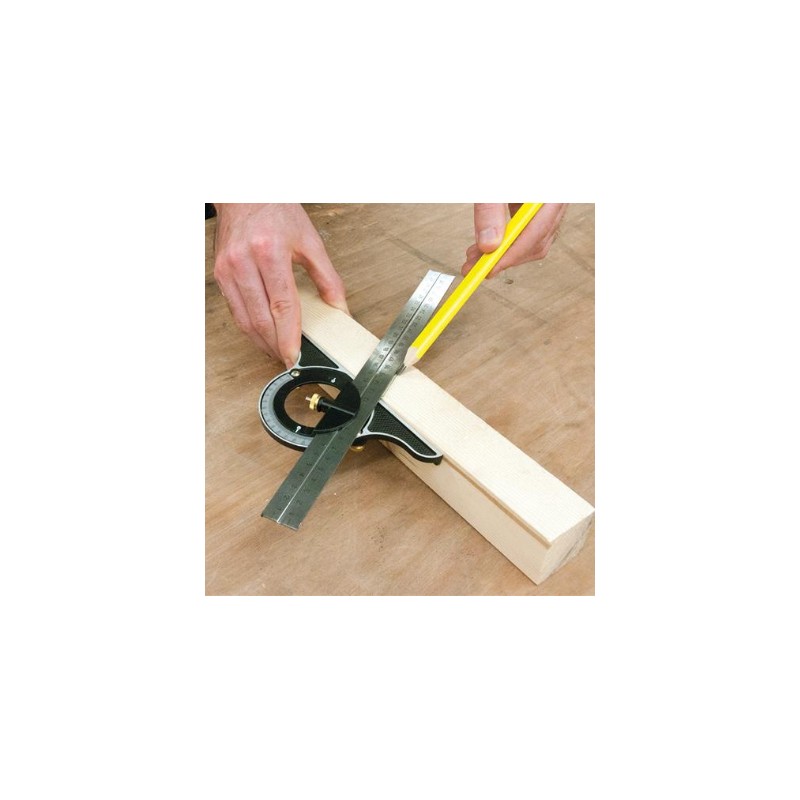 Conjunto de escuadra combinada multifunción para marcar, medir profundidad y buscar ángulos. Regla de 300 mm con graduaciones métricas e imperiales. Transportador de ángulos 180º fabricado en aluminio. Tornillos de ajuste de latón para ajustes rápidos. Nivel y escriba integrado.