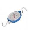 Báscula con flexómetro con mango y gancho de metal robusto. Indicador de 65 mm de diámetro con graduaciones métricas e imperiales. Flexómetro integrado de 1 m de longitud. Para pesar y medir.