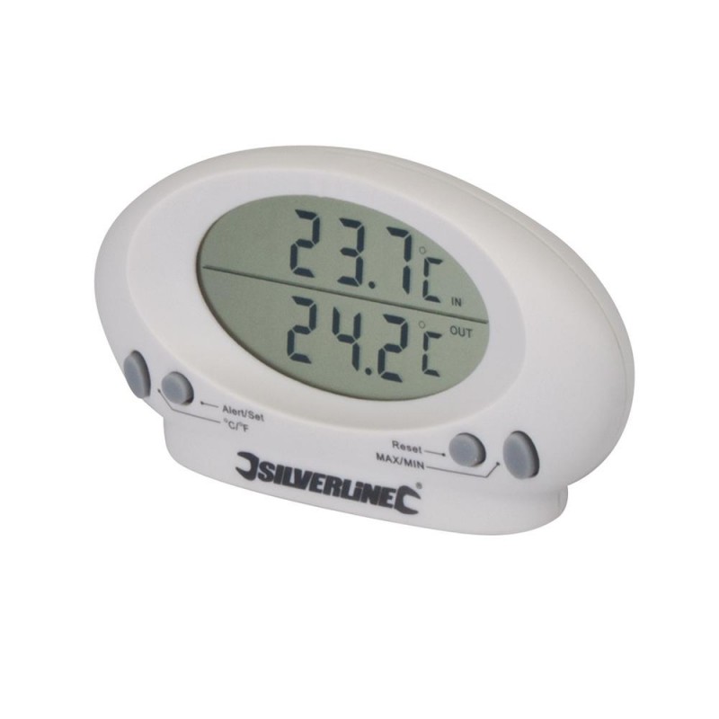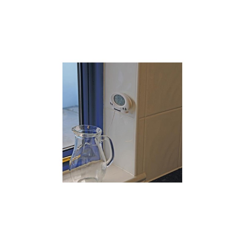 Termómetro para interior/exterior. Pantalla con dos mediciones diferentes, medición en grados Celsius y Fahrenheit. Medidas en grados Celsius y Fahrenheit. Cable de 1,7 m. Capacidad de medición en interior -10°C a +50°C (-14°F + 122°F), exterior -50°C a +70°C (-58°F + 158°F). Botones Max y Min para indicar la temperatura mínima y máxima registrada.