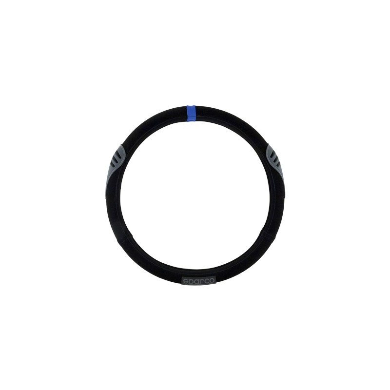Funda de volante negra 100% polyester con detalles de goma en color gris y logo Sparco en gris.